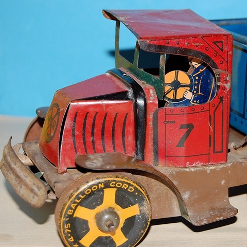 CAMION BENNE BASCULANTE FONCTIONNEL ENTRAINEMENT MECANIQUE OK INSCRIPTIONS N° 7 SUR LES PORTES DE LA CABINE DE CHAQUES COTES DE LA BENNE GRAVEL SAND BUILDERS SUPPLY CO SUR LES ROUES 28X4-75 BALLON CORD.TRACES D OXYDATION A L INTERIEUR DE LA BENNE SUR LA BANDE DE ROULEMENT DES ROUES, LE PARE CHOC AVANT LES MONTANTS DU PARE BRISE