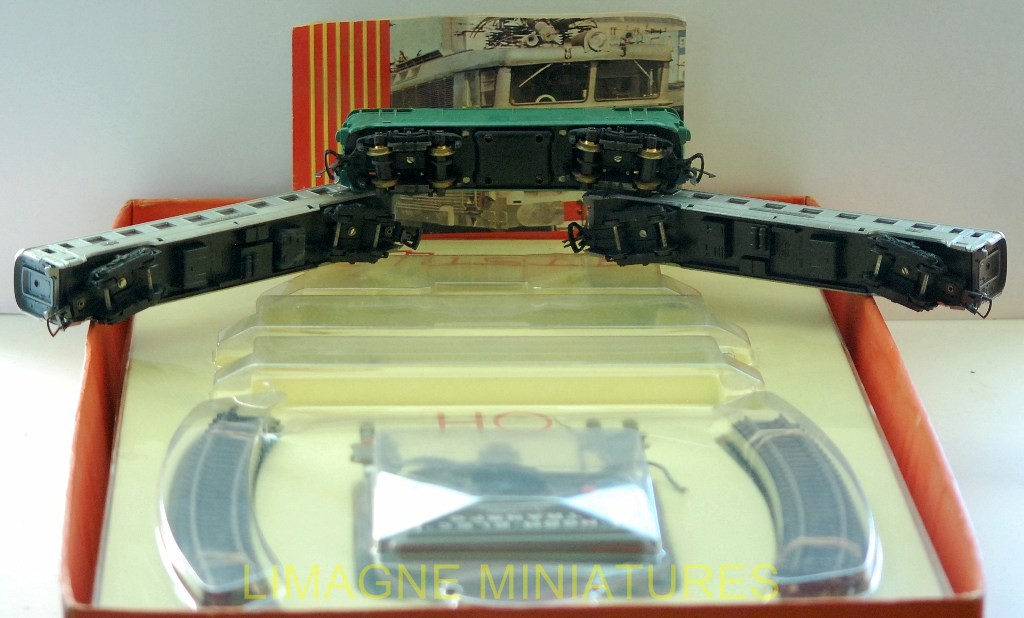comprend 1 locomotive électrique BB 9240 SNCF, 2 voitures voyageurs SNCF le mistral avec aménagement intérieur, 12 rails courbes, 1 fiche de connexion , 1 prise multiple et un transformateur norm-elec 127-220 volts 12 volts